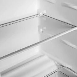 Внутреннее пространство холодильника хорошо организовано: две полки холодильной камеры и две дверные корзины предоставляют возможность удобно разместить все необходимые продукты. Полезный объем холодильной камеры — 59 литров, где установлена автоматическая капельная система разморозки, которая значительно облегчает уход за устройством. Морозильная камера имеет одну секцию и может заморозить до 2 кг продуктов в сутки, чего достаточно для хранения льда, замороженных овощей или полуфабрикатов. Ручное размораживание морозильной камеры — это простая процедура, не требующая значительных усилий.